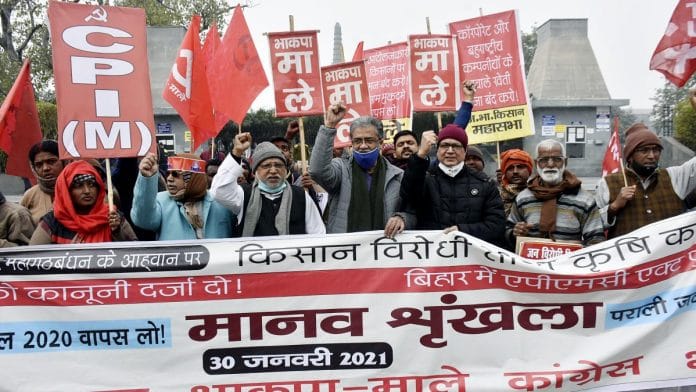 Patna: Supporters of the opposition Grand Alliance in Bihar on Saturday formed human chains across the state as an expression of solidarity with the farmers who have been agitating in the national capital seeking the repeal of the contentious farm laws.