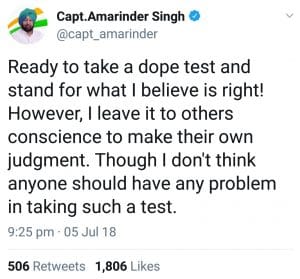 Captain Amarinder Singh was quick to respond. He issued a statement Thursday evening saying he was willing to undergo the dope test but would leave it to the conscience of other elected representatives to take a decision on if they wanted to.