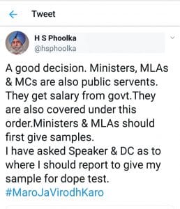 Though I'm not agnst this order,but let's b honest @capt_amarinder ji,it has been the Politicians who had patronised Drug Mafia.Instead of these orders,as head of the State,U should have taken the first step.Nevertheless I got my DOPE TEST done today.When r U getting it done Sir? pic.twitter.com/1GOSVvJlUW