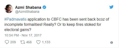 The CBFC sends Padmavati back to filmmakers saying that its application was “incomplete.”