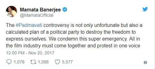 November 20: West Bengal chief minister Mamata Banerjee says the Padmavati controversy is a “calculated plan of a political party to destroy the freedom to express ourselves”
