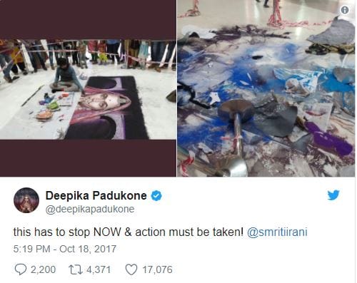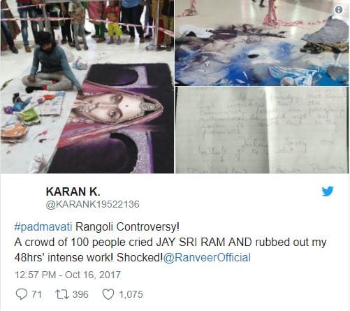 October 16: A rangoli made by Surat artist Karan K over 48 hours, and inspired by Deepika Padukone’s character in the movie, is destroyed. Five men are arrested.