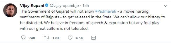 November 22: Gujarat Chief Minister, Vijay Rupani, becomes the 4th CM to oppose the release of Padmavati. He tweeted the following:
