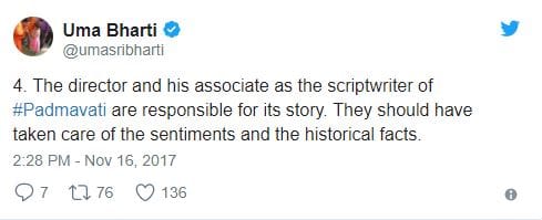 November 4: Union Minister Uma Bharti tweets an open letter suggesting the formation of a committee consisting of the historians, filmmaker, the protesters and censor board to settle the conflict.
