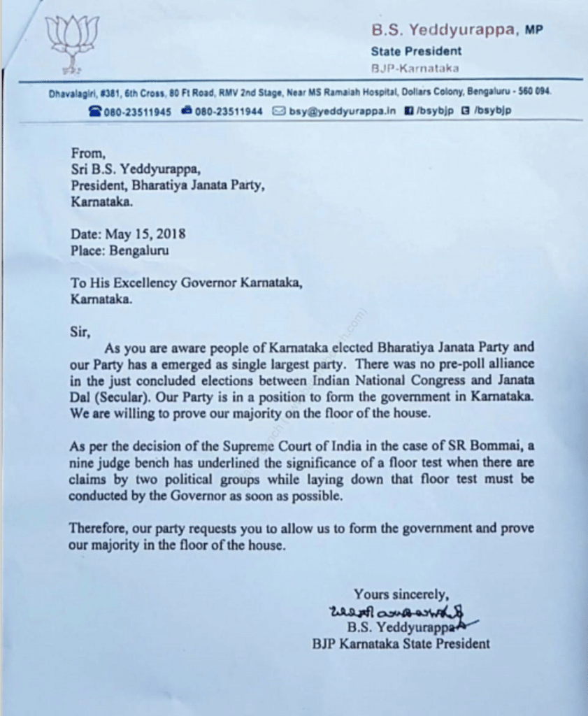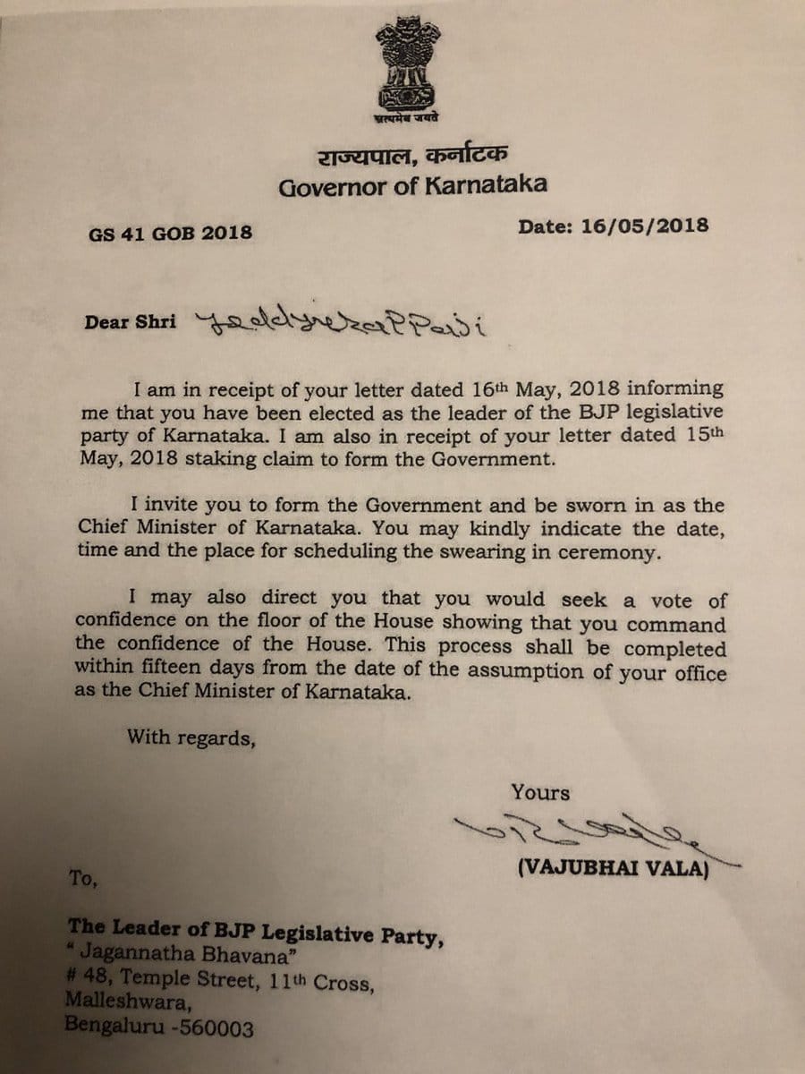 9:05 pm: Governor Vajubhai Vala invites B.S. Yeddyurappa to form the government and prove his majority on the floor of the house. He surprises nearly everybody by granting the BJP 15 days to do so.