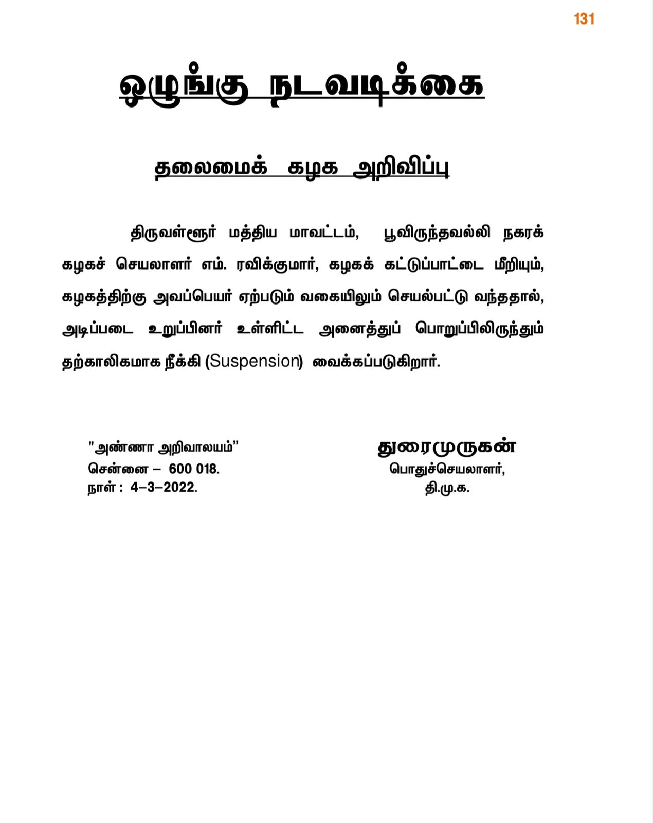 DMK functionary in Poonamallee, M Ravi Kumar has been suspended from the party for indulging in anti-party activities by DMK general secretary Duraimurugan while other DMK leaders are also likely to be suspended from the party.