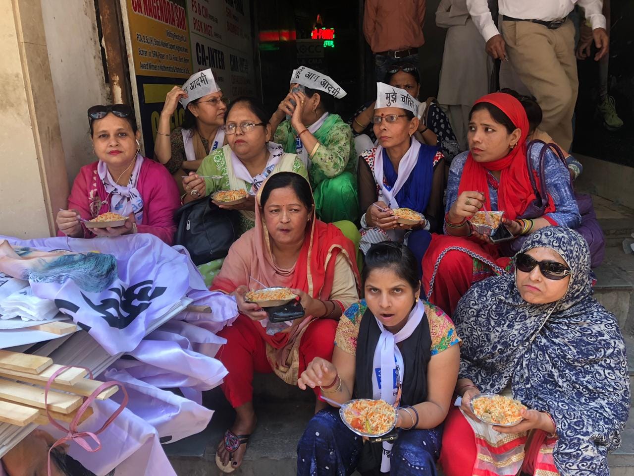 Mehak Narula, a homemaker born and brought up in Preet Vihar, East Delhi, is among those queued up outside a food stall beside her home. There is a group of AAP workers eating at the stall but Narula says she doesn’t identify with them.