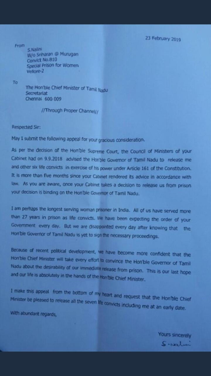 In September 2018, the AIADMK-led Tamil Nadu cabinet had approached Governor Banwarilal Purohit to seek their release, but the governor is yet to act on the demand, a fact Nalini cited in her letter to the Chief Minister.