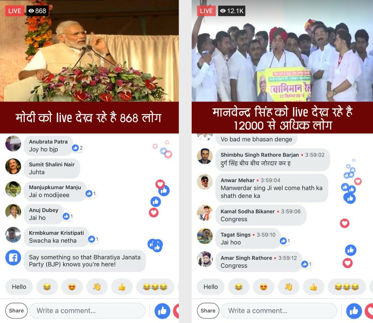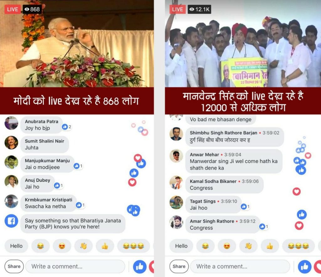 On the day Manvendra Singh quit the BJP, Prime Minister Narendra Modi was at a rally. But the story of the two events lies in the interesting Facebook streaming data they generated. While the BJP officially encourages people at its rallies to livestream, Modi’s rally produced 900 livestreams, while over 12,000 beamed Singh’s (a screenshot below).