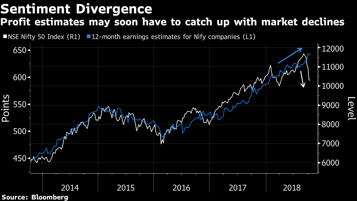 Rupee’s longest rout since 2000 and oil’s surge to a four-year high have put earnings estimates of Indian companies at the risk of downgrades. Analysts have boosted the average profit forecast for NSE Nifty 50 Index companies by 9.2 percent this year, shrugging off a 12 percent slump in the gauge since August. History suggests the divergence won’t extend for long, and the growing stress in Asia’s third-largest economy may soon translate into lower projections. – Bloomberg