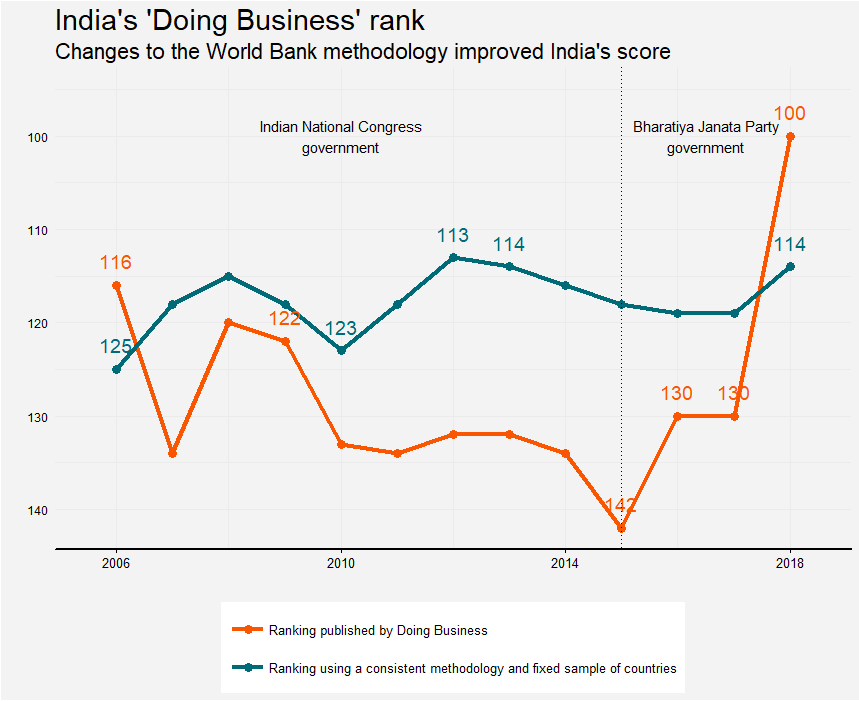 It seems that India’s rank moved up and down more due to the addition of new countries to the Doing Business sample than changes in methodology.