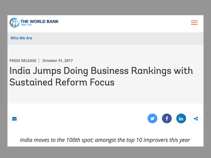 Last October, the World Bank announced that “India Jumps Doing Business Rankings with Sustained Reform Focus” moving from 130th to 100th overall. (Note the focus on the jump, or change.) The Indian press and pundits declared that the Bank had “endorsed Modi’s reform credentials.” Modi himself turned the change in Doing Business rankings into a talking political sales pitch.