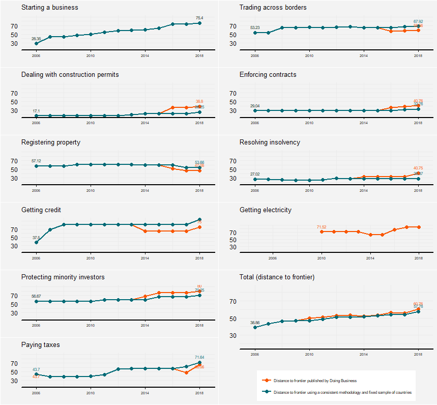 This time we use all the indicators available for a given year, relying on the World Bank’s own scores for each country and each component. Instead of dropping new indicators, we splice the series together whenever there is a methodological innovation. So for instance, when the World Bank changed the underlying indicators in the “ease of getting credit” index in 2014, they kindly reported the score using both methodologies for that year. India scored 81.25 on the old methodology in 2014 and 65 using the new method. Our approach is simply to multiply all of India’s credit scores by 1.25 (=81.25/65) for every year after 2014, so there is no artificial jump in India’s credit score.