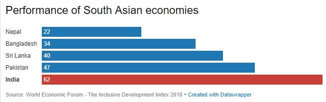 India also did not make it to the top 10 most inclusive emerging and developing economies, where its neighbours Nepal, China and Sri Lanka made a mark.