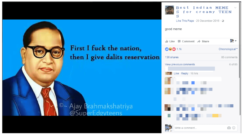 Best Indian Memes for Creamy Teens is another page which has been reported for casteist content in the past over similar content, including a photo of Dr B.R. Ambedkar with the caption: “First I f**k the nation, then I give dalits reservation (sic).”