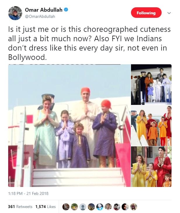 However, Omar Abdullah, former chief minister of Jammu and Kashmir, tweeted Wednesday about how the Trudeau family’s clothes are a “bit much”.