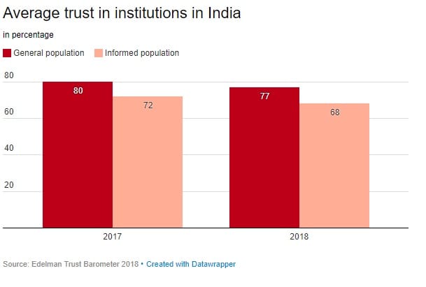 The Edelman Trust Barometer 2018 shows that of the 28 countries surveyed, six, including India, have shown a strong loss of trust. India recorded an aggregate loss of 13 percentage points in trust compared to last year.