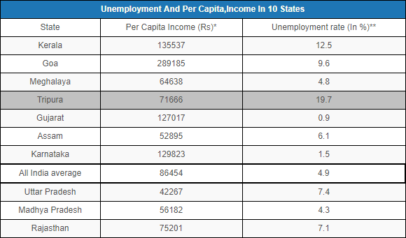 Tripura fares well on multiple social and health indicators, but has the highest unemployment percentage in India.