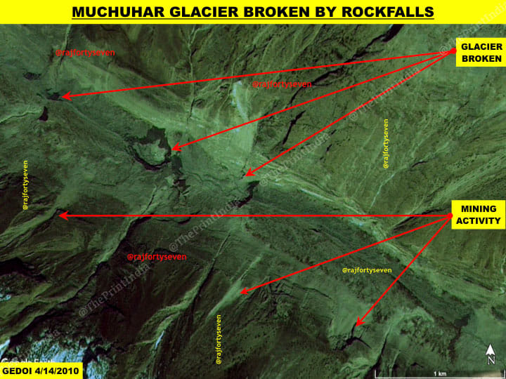 There are many tracks in the Muchuhar valley ending at mined areas. The rockfalls from these areas onto the glacier are clearly identified on the satellite imagery.