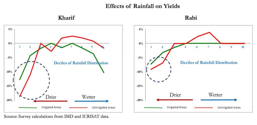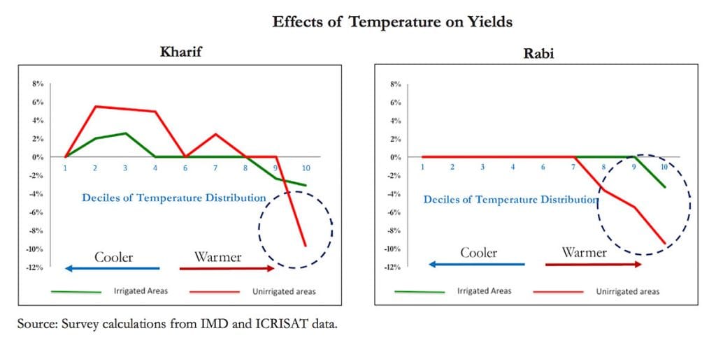 There are many common conclusions between the Indian economic survey report and the Australian study. Two of the most important ones are that extreme weather events are responsible for the loss in crop yields while minor fluctuations around average conditions have little to no effect.