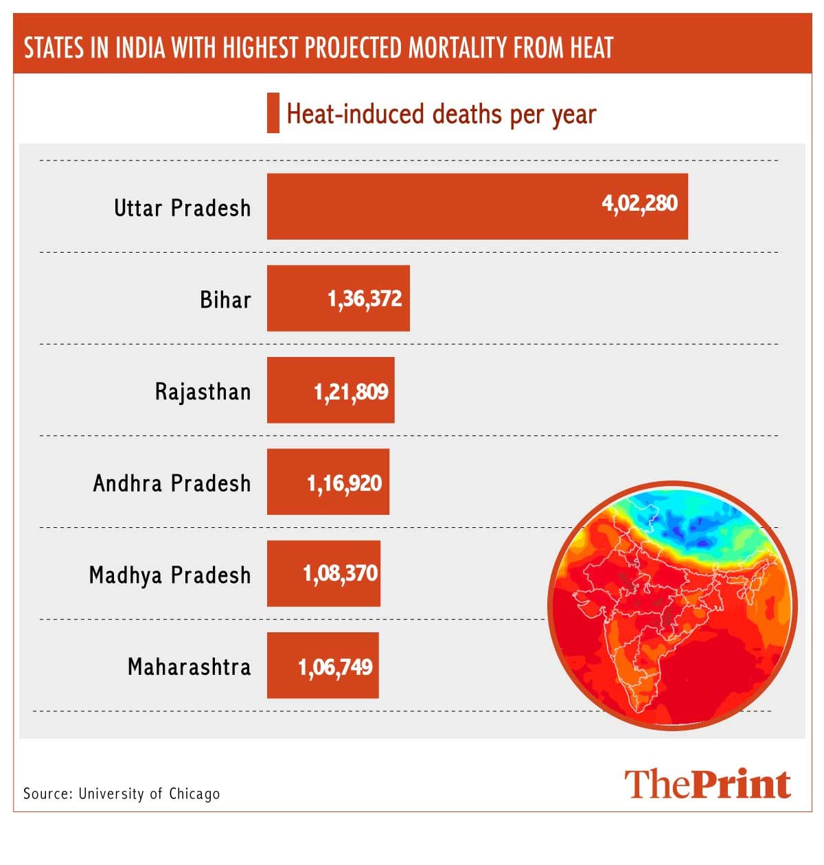 This spike in temperatures will have an adverse impact on the mortality rate. Uttar Pradesh is expected to bear the brunt of it with a projected annual death rate of 4,02,280, while Bihar, Rajasthan, Andhra Pradesh, Madhya Pradesh and Maharashtra are all expected to see over 1 lakh deaths per annum. These six states are set to account for 64 per cent of all deaths caused by the rising temperatures.