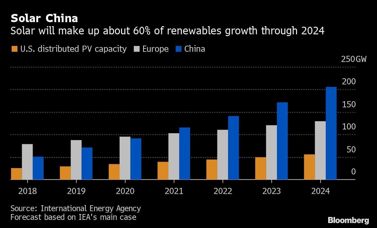 As countries in China, Europe and the U.S. increase deployment of wind turbines and solar panels, the share of renewables in global power generation will rise to 30% in 2024, up from 26% now, the IEA said.