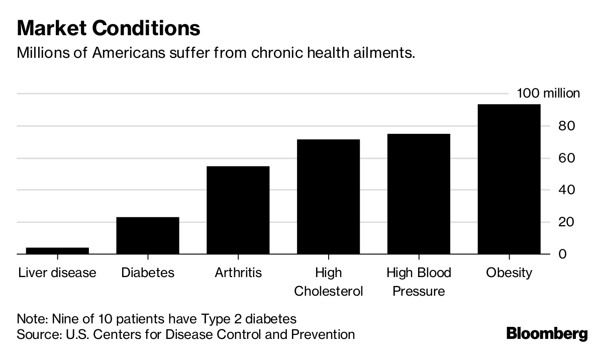 Pfizer’s focus on fructose is unique among companies developing medicines for asymptomatic NASH, which is projected to be the top reason for liver transplants by 2020. Intercept Pharmaceuticals Inc., Madrigal Pharmaceuticals Inc. and Gilead Sciences Inc. have NASH drugs in late-stage studies, but they are targeting the sickest patients. The NASH drug market is expected to be worth about $40 billion by 2025.