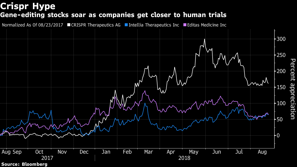 Three public companies leading efforts in the space — Crispr Therapeutics AG, Editas Medicine Inc. and Intellia Therapeutics Inc. — have seen their shares skyrocket over the past year before dosing even a single patient in a trial. Citi analysts have forecast the global market for Crispr technologies may reach $10 billion by 2025.