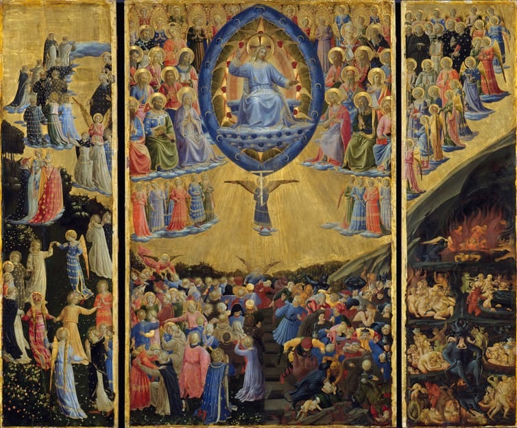 This was seeing God “face to face”, and not through “a glass darkly”. It was an eternity centred on God or the heavenly Christ. Thus, The Last Judgement (1425-30) by Fra Angelico shows Christ seated on a throne surrounded by the angels, Mary and the saints. His right-hand points up to Heaven, his left towards Hell. On Christ’s right, angels are taking the saved through a paradisal garden to a heavenly walled city, while on his left, demons are driving the wicked into Hell.