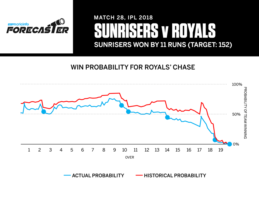 Processing data for the IPL 2018 match between Rajasthan Royals and SunRisers Hyderabad, for example, at a point where Royals needed 50 runs from 30 balls with six wickets in hand (an easy enough T20 run-chase), the tool predicted a 41 per cent chance of them winning. The probability was so low because the Royals had lost all of their best batsmen — they actually went on to lose the match by 11 runs.