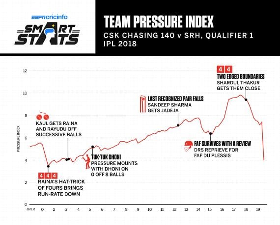 One of the primary parameters to calculate smart numbers well is the Pressure Index. This determines the quality of runs scored and thus their value as well. For every ball, the Pressure Index algorithm quantifies the amount of pressure on a batsman between values of 0 and 10. Runs scored off each ball are weighted based on the Pressure Index value on that ball. As a result, runs scored in high-pressure situations will be worth more than otherwise.