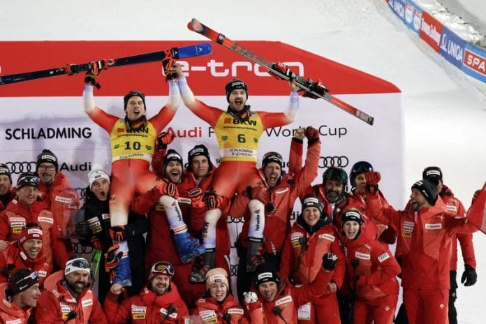 (Reuters) – Switzerland’s Loic Meillard won the men’s World Cup giant slalom under lights in Schladming on Wednesday, with fellow countryman Gino Caviezel second fastest down the foggy slopes in the Austrian Alps.