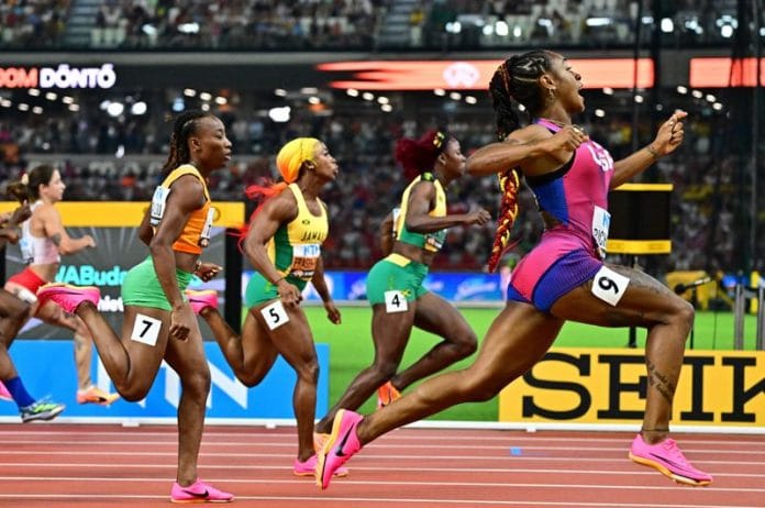 Coming after Noah Lyles’s victory in the men’s race on Sunday, the U.S. is firmly back on top of the sprinting mountain after so long playing second-fiddle to Jamaica.