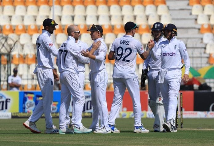 With Pakistan’s Abrar Ahmed not batting due to illness, England reduced the hosts to 220-9 after some early resistance as Jack Leach bagged the three wickets needed and sparked huge celebrations among a small but vocal group of travelling fans.