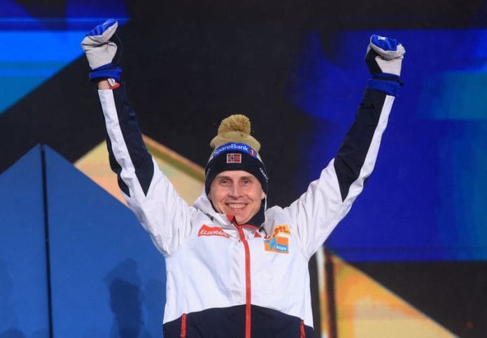 Martin Loewstroem Nyenget took third, 12.6 seconds behind Krueger and completed a clean sweep on the podium for Norway with King Harald, who greeted the winner afterwards, watching on.