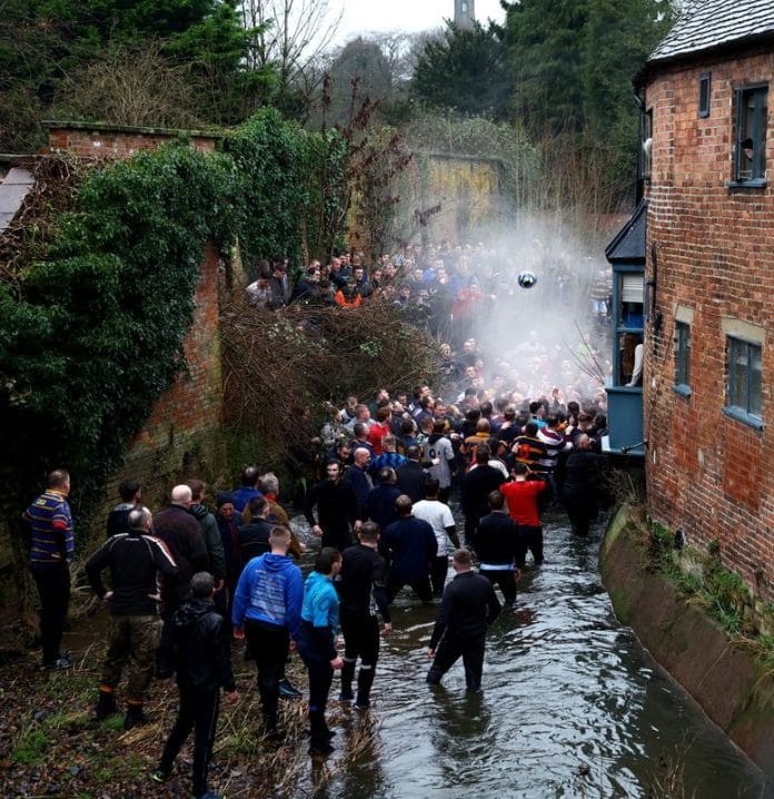 The locals clamber over fences, through muddy fields and into the River Henmore. The game is more rugby than football, with a large, round leather ball thrown or pushed through a giant scrum, called the hug.
