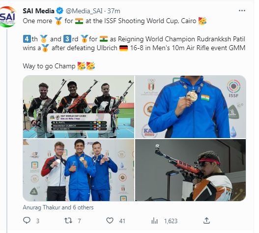 “One more medal for at the ISSF Shooting World Cup, Cairo 4th medal and 3rd gold for India as Reigning World Champion Rudrankksh Patil wins a gold after defeating Ulbrich (Germany) 16-8 in Men’s 10m Air Rifle event GMM Way to go Champ,” tweeted Sports Authority of India (SAI) Media.