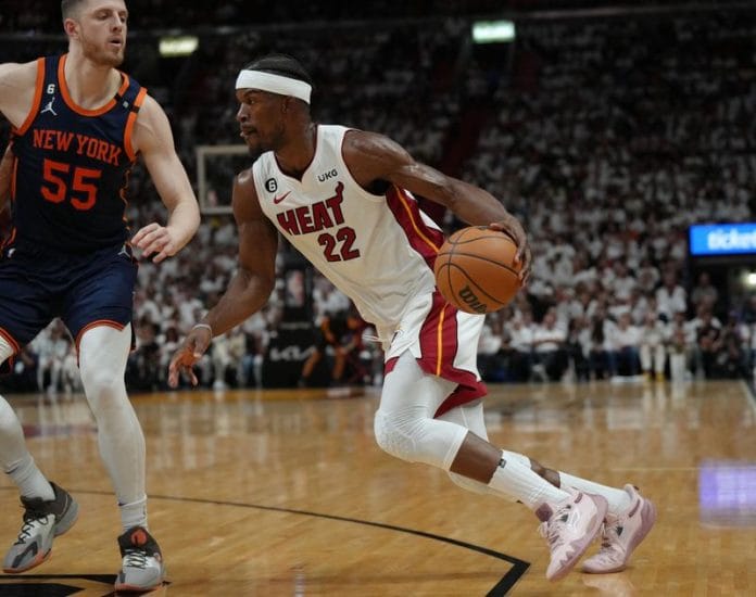 Six-time All-Star Jimmy Butler put up 24 points with eight rebounds and four assists to steer the Heat past a Knicks team that was desperate to stay alive in front of a raucous Miami crowd.