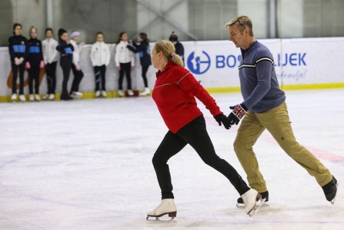 Dressed in black outfits and assisted by Sarajevo young skaters, they performed a shortened version of the routine that cemented their status as legends of the sport and household names in Britain at the Skenderija Olympic Hall.