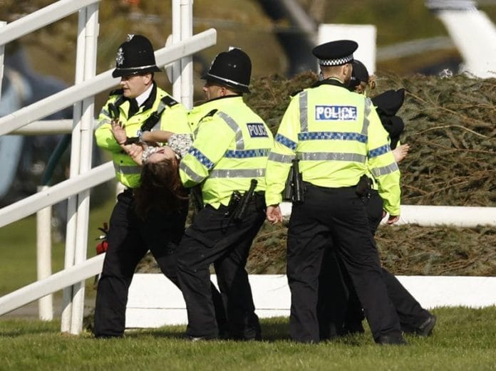 Police said they had arrested 118 people on suspicion of offences including criminal damage and causing public nuisance after protesters sought to scale the perimeter fence and access the track to prevent the 40 horses from starting the race.