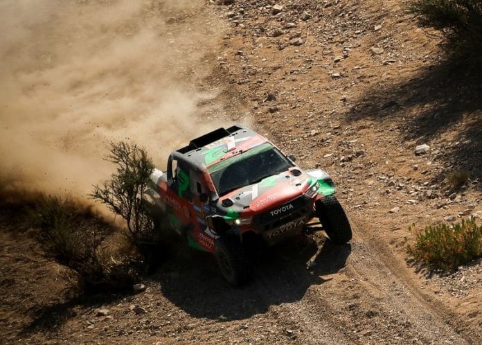 Saudi Arabia’s Yazeed Al-Rajhi was declared the winner of the 48-hour Chrono stage, despite a two-minute penalty for speeding, in a non-works Overdrive Toyota but the victory was later handed to team mate Rokas Baciuska.