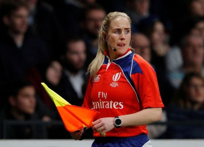 She became the first woman to take charge of a top level men’s game in the United Kingdom in 2018, having been named World Rugby Referee of the Year a few months earlier, and switched to the role of TMO following the birth of her son.