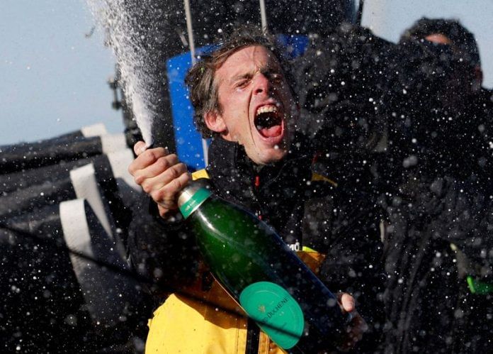 Once his boat was moored at the dock, Dalin sprayed it with champagne before he jumped onto the land with both feet, to the sound of French artist Orelsan, who, like him, hails from Normandy.