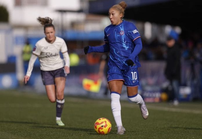 LONDON (Reuters) – Chelsea’s Lauren James scored in stoppage time to snatch a 2-1 win at home to Everton on Sunday that maintained their lead atop the Women’s Super League, with the reigning champions once again finding a way to win when the odds looked stacked against them.