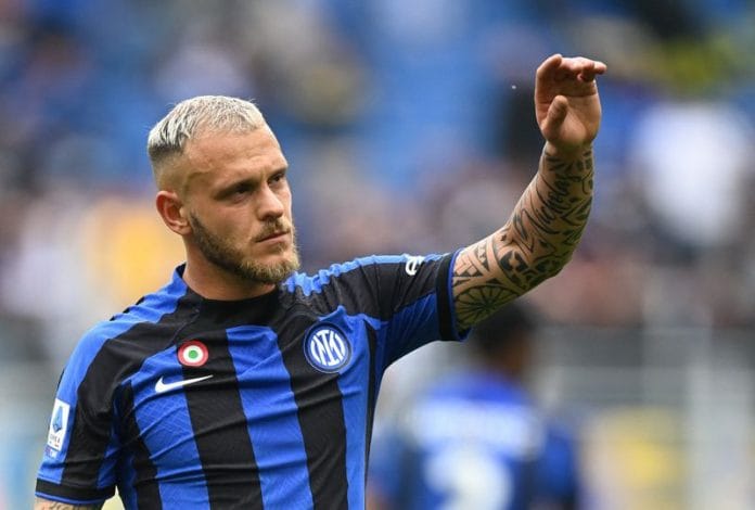 Inter defender Denzel Dumfries squared the ball inside Roma’s six-yard box and Dimarco was in the right place to tap it in from a tight angle just after the half-hour mark.