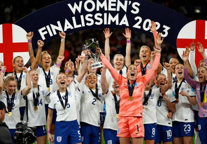 LONDON (Reuters) – England beat Brazil in a penalty shootout in a thrilling inaugural Women’s Finalissima on Thursday, the second straight international trophy hoisted by the Lionesses at a jam-packed Wembley Stadium.