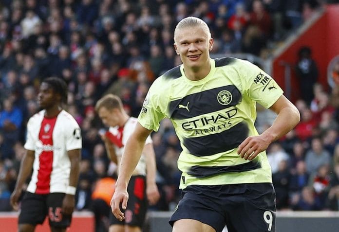 SOUTHAMPTON, England (Reuters) – Erling Haaland netted a brilliant bicycle kick as he scored a brace on his return to Manchester City’s starting lineup after injury in a 4-1 Premier League win at bottom side Southampton on Saturday to keep the pressure on leaders Arsenal.