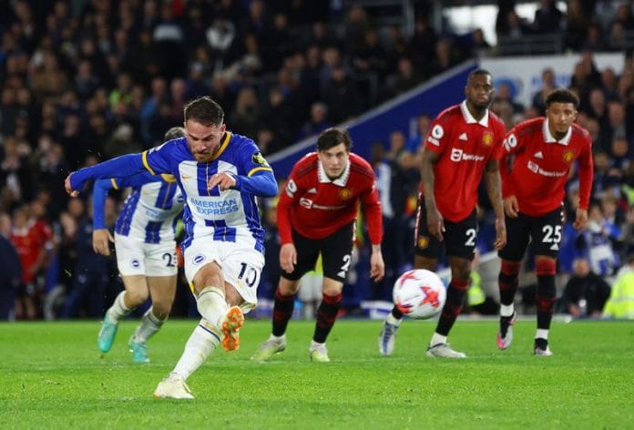 BRIGHTON, England (Reuters) – Brighton & Hove Albion midfielder Alexis MacAllister fired the winner from the penalty spot deep into stoppage time to snatch a 1-0 win for his side over Manchester United in a pulsating Premier League clash on Thursday.