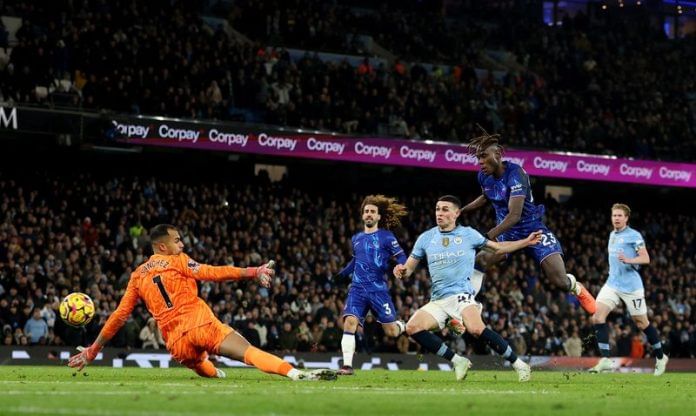 MANCHESTER, England (Reuters) – Manchester City bounced back after conceding an early goal to beat Chelsea 3-1 at the Etihad Stadium on Saturday, sparing the blushes of their debutant defender Abdukodir Khusanov whose error gifted the visitors the lead.