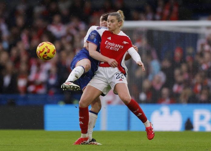 LONDON (Reuters) – Chelsea’s Guro Reiten scored an 83rd-minute penalty as her side beat Arsenal 1-0 in front of a crowd of 34,302 at Stamford Bridge on Sunday to remain top of the Women’s Super League (WSL), with Gunners defender Katie McCabe sent off.